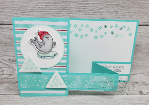 How cute is this card? The Freezin’ Fun stamp set and dies is a cute ensemble that you could use when sitting down with your kids or grandkids to make lots of projects. The three little characters having winter fun are sure to put smiles on their faces. It put a smile on my face…